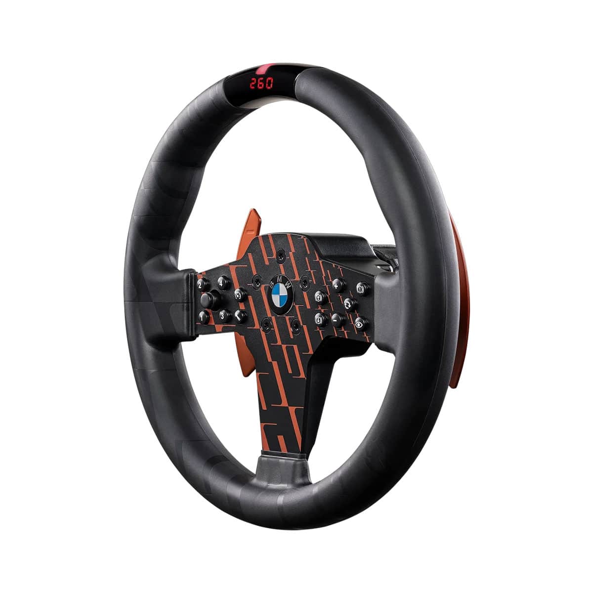 A unique BMW-designed graphic stretches across the front face and rim. The 300 mm diameter is suitable for many vehicle types, and the lightweight construction retains fine force feedback detail even at low torque settings.